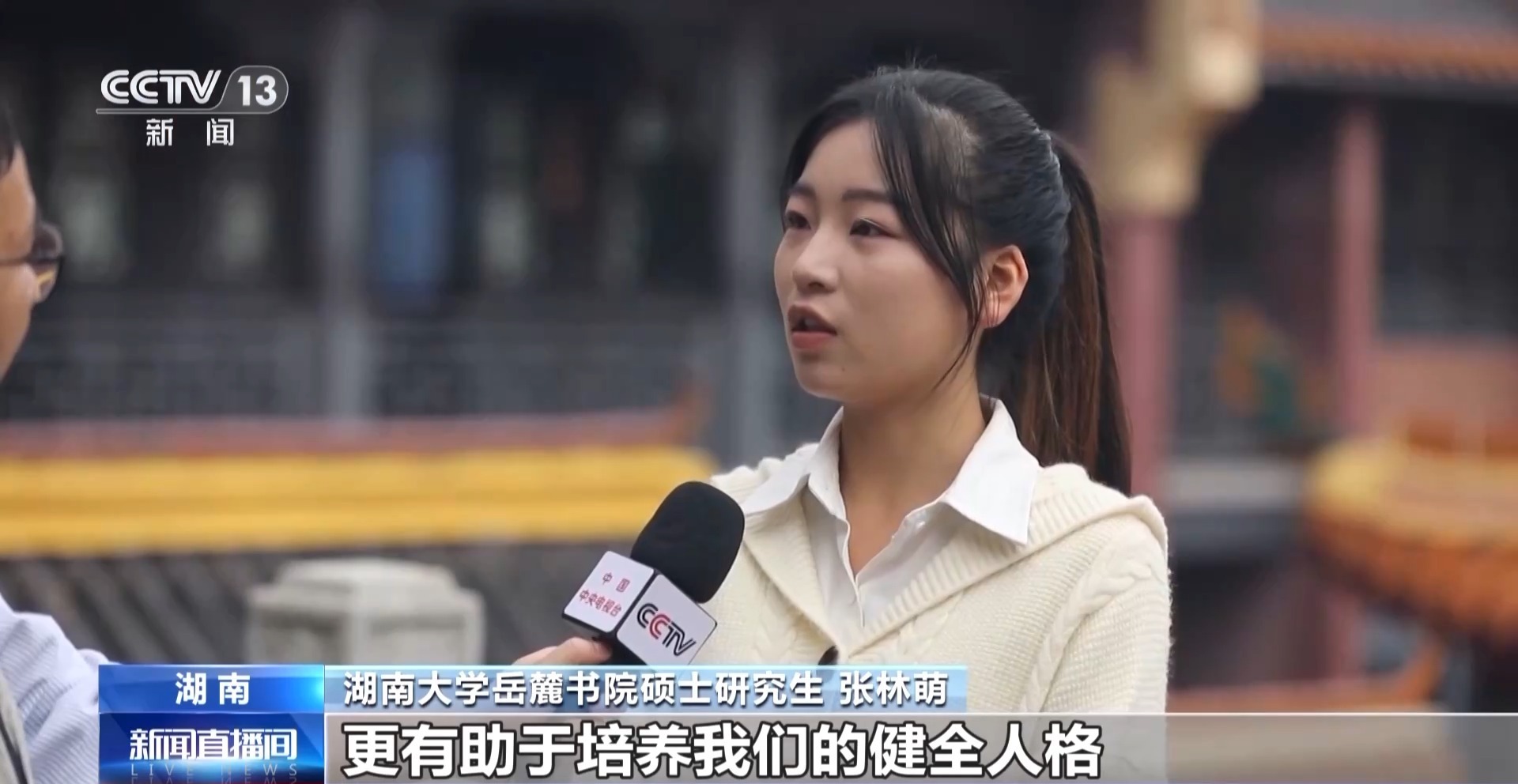 湖南大学岳麓书院副院长 陈仁仁:我们就对岳麓书院这个文化遗产进行研究与活化利用。比如说我们有一个项目叫“习礼育人”,是通过“三礼三祭”来展开的,让同学们能感受到历史的厚重和得到一种人格的熏陶。我们的理念就是培养人,他的人格和学业是紧密结合在一起的,“德”和“业”是并进的。