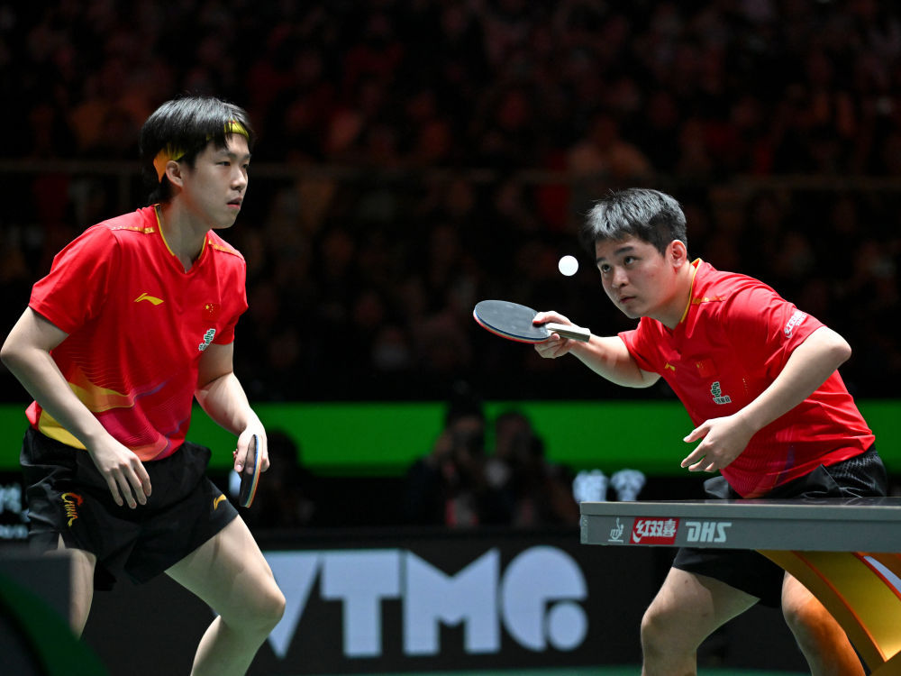 ↑ 中国队组合王楚钦/林诗栋(右)在男双比赛中。他们1比0战胜法国队组合艾利克斯·勒布伦/费利克斯·勒布伦。 新华社记者 胥冰洁 摄