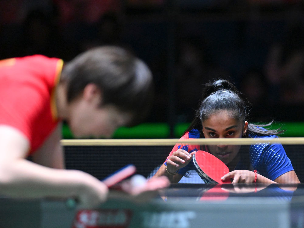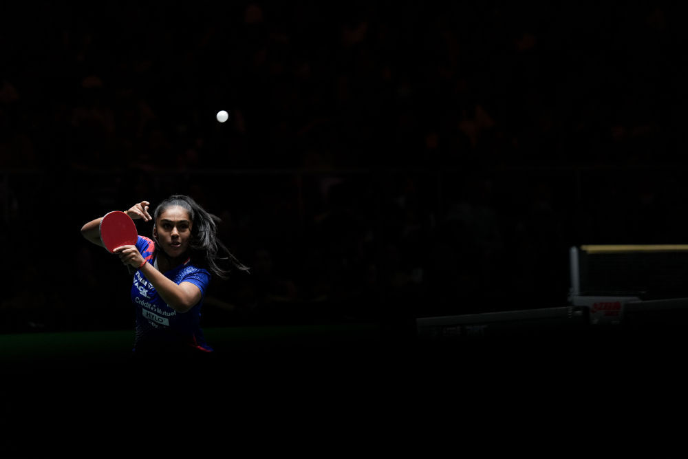 ↑ 法国队选手普利蒂卡·帕瓦德在女单比赛中。她0比3不敌中国队选手王曼昱。 新华社记者 胥冰洁 摄