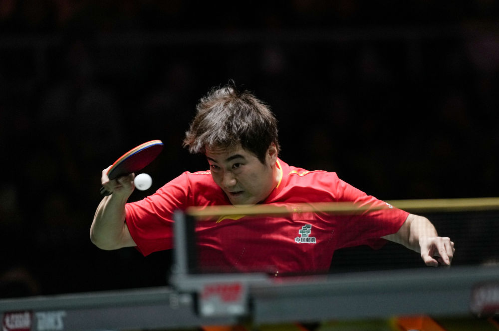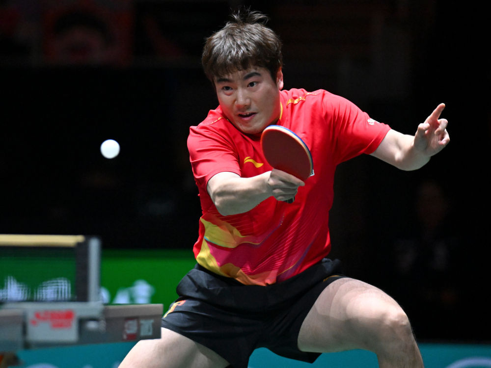 ↑ 中国队选手梁靖崑在男单比赛中。最终,他1比2不敌法国队选手费利克斯·勒布伦。 新华社记者 胥冰洁 摄