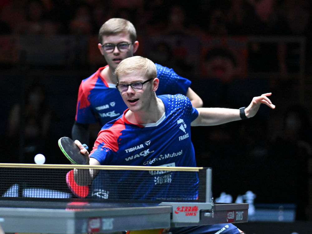 ↑ 法国队组合艾利克斯·勒布伦/费利克斯·勒布伦(右)在男双比赛中。他们0比1不敌中国队组合王楚钦/林诗栋。 新华社记者 胥冰洁 摄