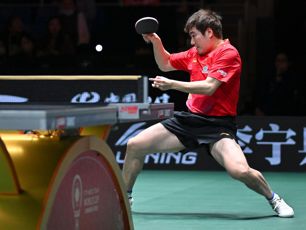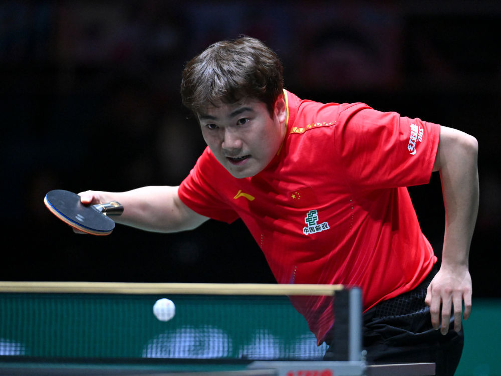 ↑ 法国队选手费利克斯·勒布伦在男单比赛中。最终,他2比1战胜中国队选手梁靖崑。 新华社记者 胥冰洁 摄