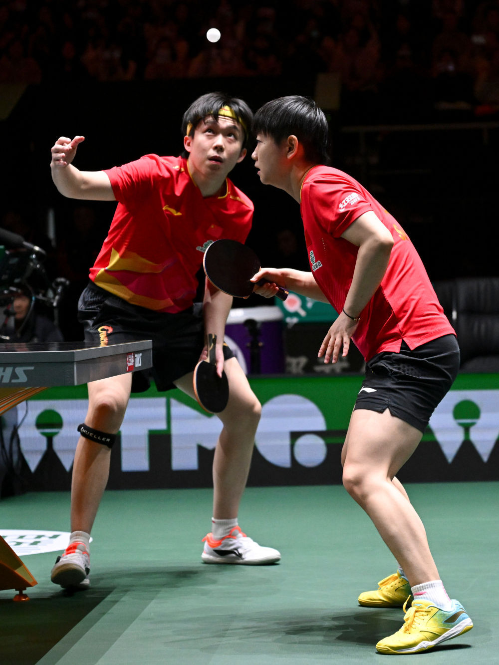 ↑ 中国队组合王楚钦(左)/孙颖莎在混双比赛中。他们3比0战胜法国队组合艾利克斯·勒布伦/袁嘉楠。 新华社记者 胥冰洁 摄