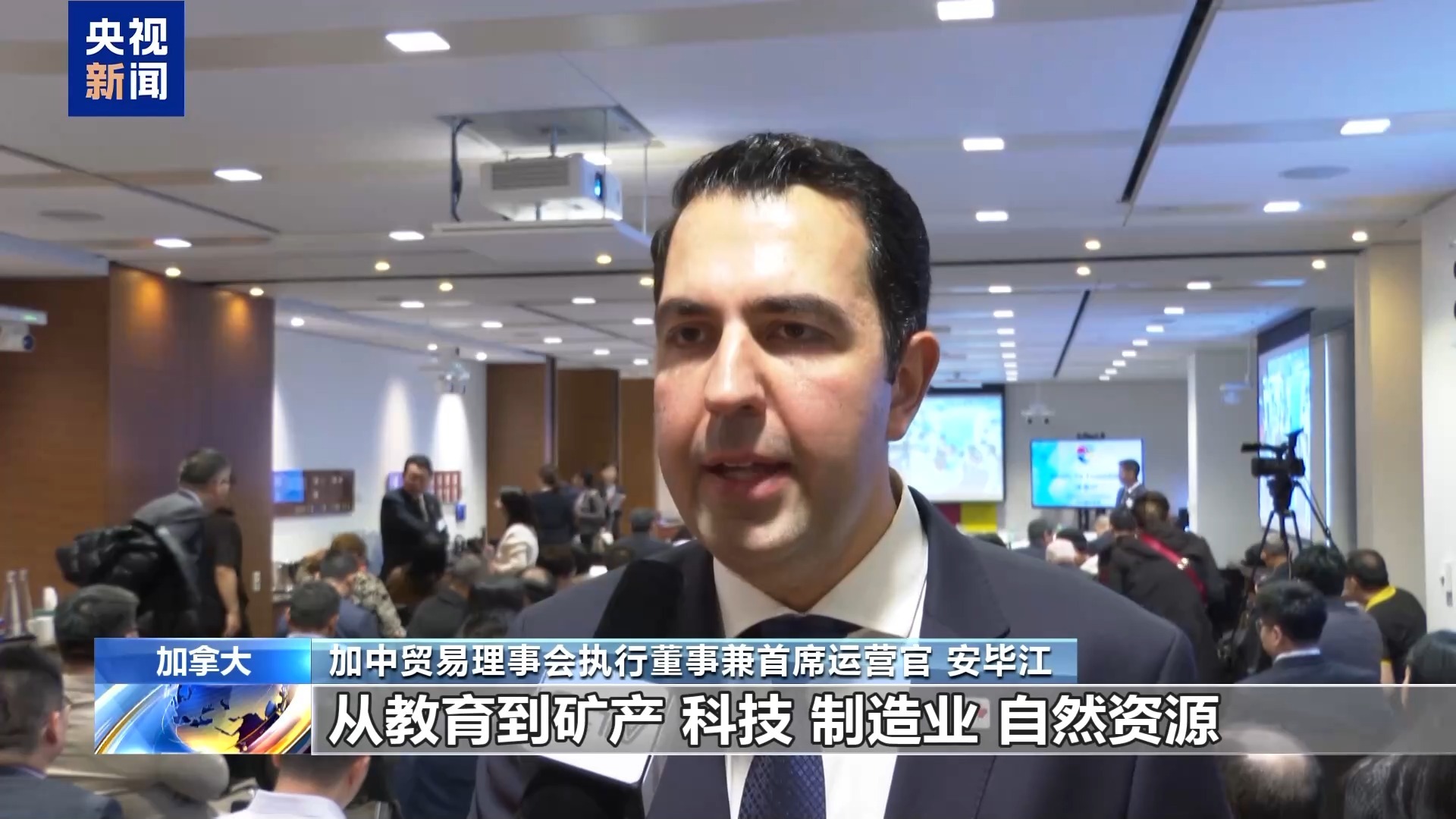 加中贸易理事会执行董事兼首席运营官 安毕江:加中两国在不同领域都有合作,从教育到矿产、科技、制造业、自然资源,以及农产品,这些领域都蕴藏着巨大的潜力。两国经济的互补性非常显著,各个领域都存在机遇。