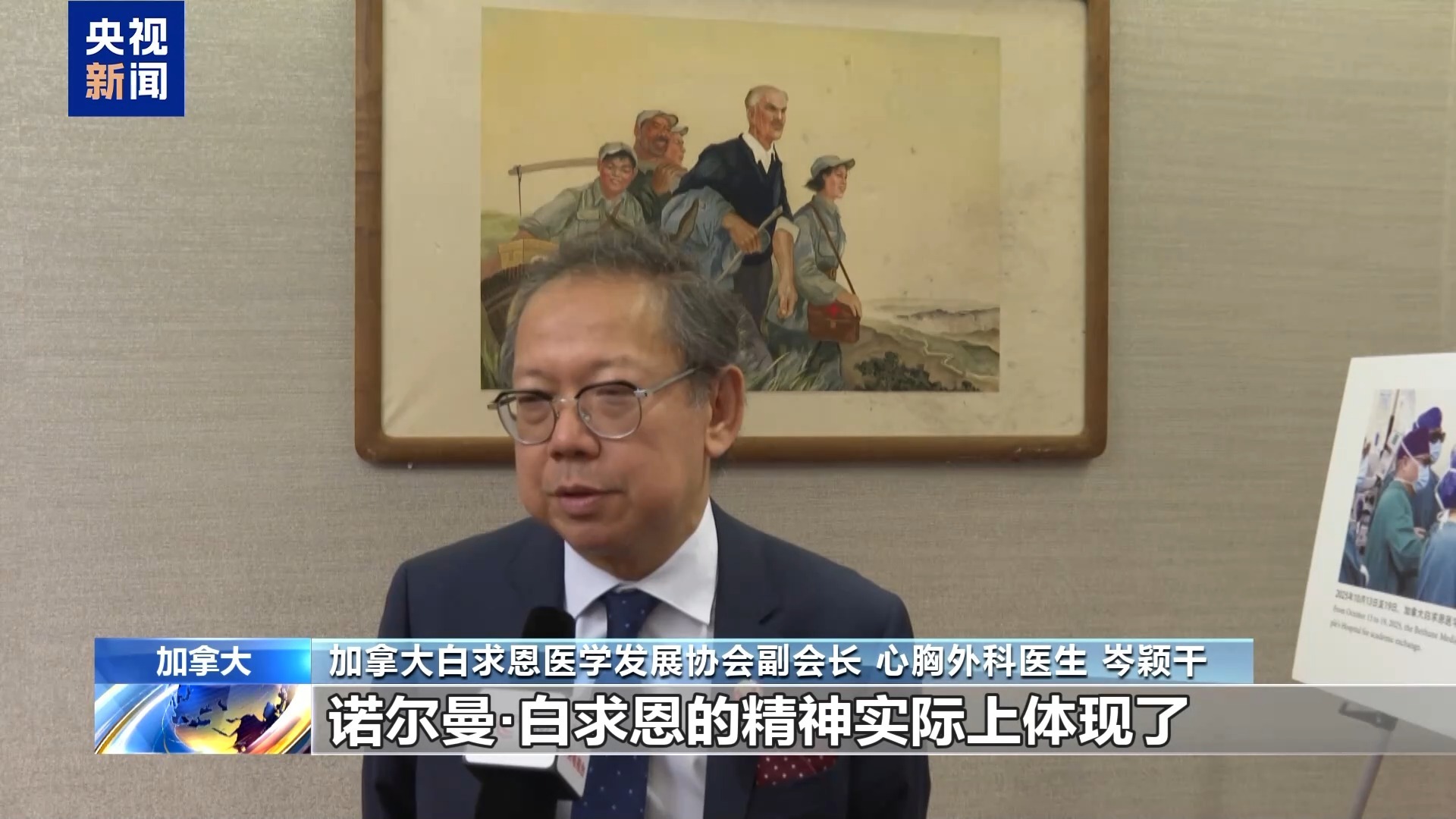 加拿大白求恩医学发展协会副会长 心胸外科医生 岑颖干:诺尔曼·白求恩的精神实际上体现了所有患者都应该享有这种权利的理念,而他的行动也正是他身体力行的体现。