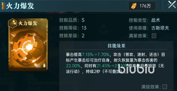 古斯塔夫同样属于战术类,他的核心技“火力爆发”能让暴击率提升,每次攻击产生暴击之后,还能恢复此次伤害的22%自身耐久,同时有一定几率让目标进入短路状态,持续2秒时间无法移动,整体是一个攻击、生存和控制都有的角色,可搭配的也会比较多。