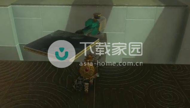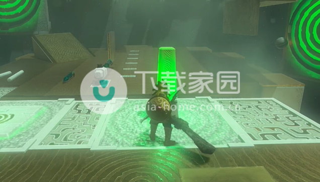 3、诺乌用究极手拿起刚才的位置平台,铺在路上,介绍再用武器去打绿柱子,塞尔说王神庙把球打到黄圈中。