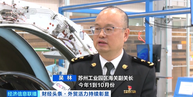 苏州工业园区海关副关长 吴林:航空航天装备产业近年来稳中求进,今年1到10月份,辖区内相关企业进出口总值达168亿元,同比增长9.7%,保持了稳定增长的态势。外贸出口方面呈现种类升级、市场多元的格局,核心产品以飞机结构件、发动机零配件为主,出口占比达90%。