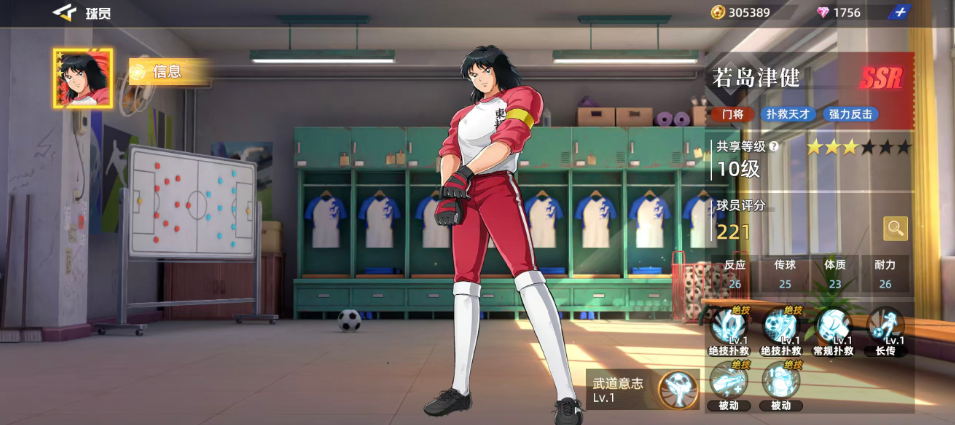 如果是希望他扑救属性能够得到足够的增益,其实还是主要靠若堂流·爆发这个技能产生的被动效果,其中会给若岛津健的扑救属性增加3.5%的数值,然后在若岛津健释放扑救技能成功将球扑出后,下次再放扑救技能的时候还会增加8.3%爆发属性,这个效果好用是好用的,就是5秒内只能触发一次,所以要把握好时间,另外的武道鼓舞这个技能会为若岛津健带来反应属性增加3.5%的被动效果,如果是若岛津健使用扑救技能成功将球扑出后,球更容易飞向己方的其他队友,且己方禁区内的所有队友争顶属性也会得到增加6.7%的增益哦。