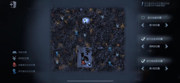 求生者:在月亮门角落机、大房楼梯下、中场、小木屋出生