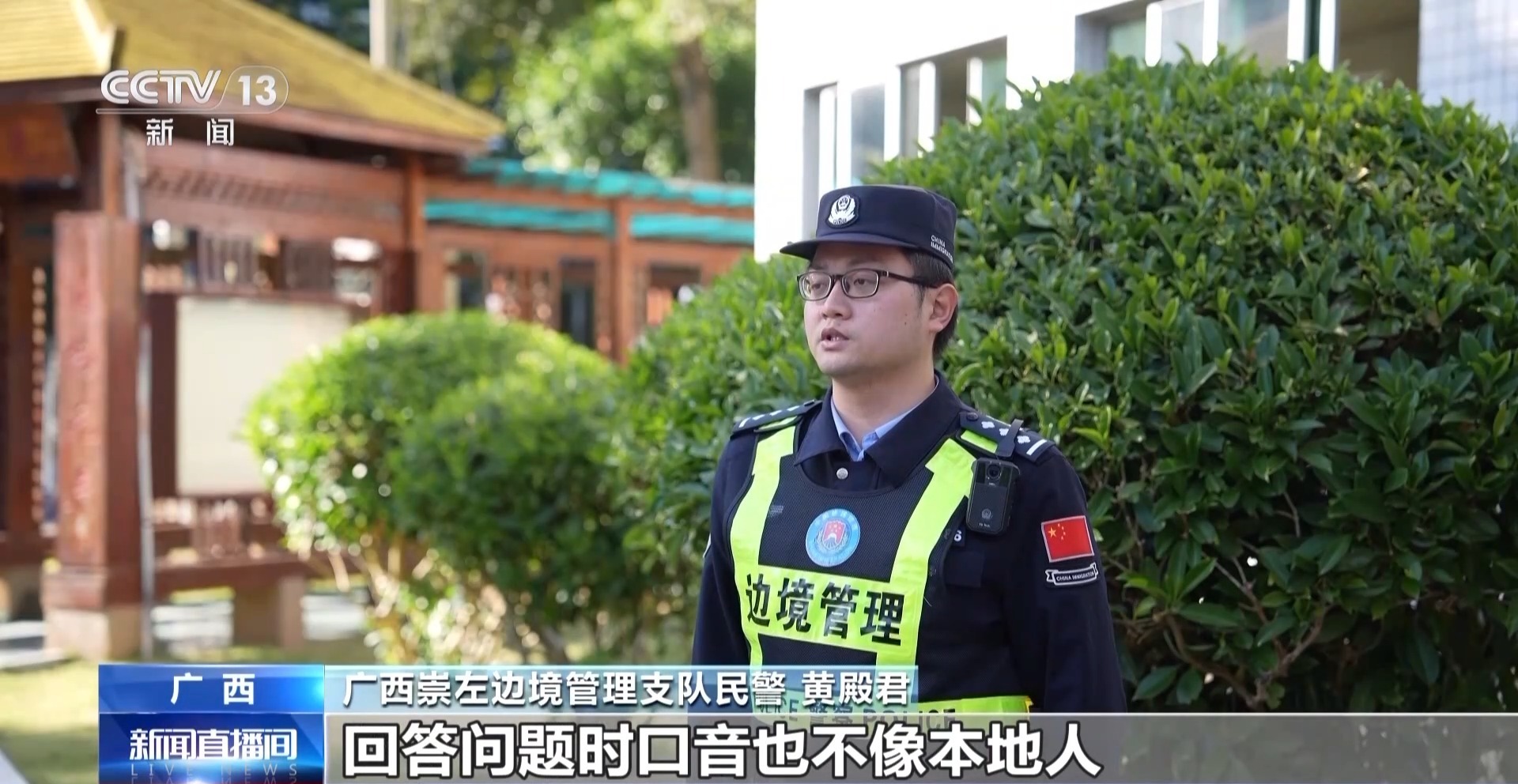 广西崇左边境管理支队民警 黄殿君:当时嫌疑车辆经过我们的卡点时,在检查中我发现车内乘客虽然自称工人,但是他们的安全头盔和反光背心都是崭新的,回答问题时口音也不像本地人,这是很反常的。