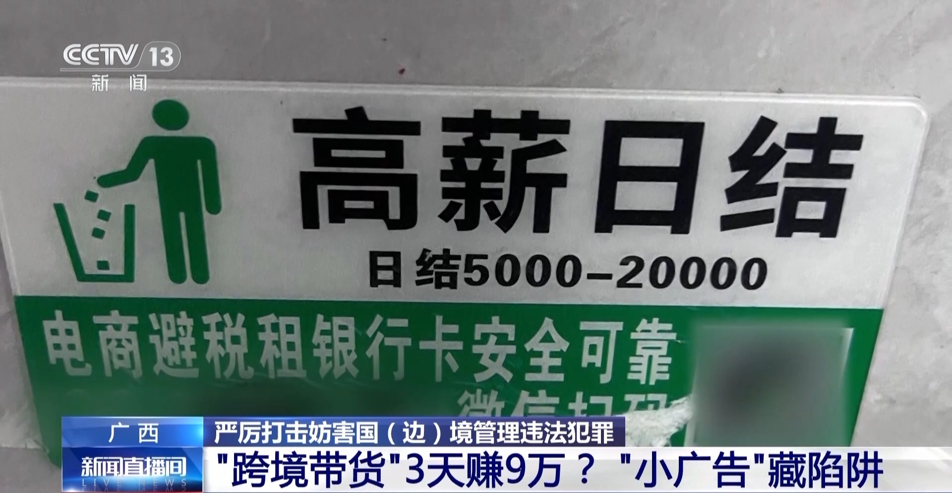 这些“蛇头”精心设计的骗局是什么?为什么会有人频频落入陷阱呢?来看近日防城港边境警方侦破的一起案件。7人受“高薪日结”“日入数万”等“小广告”诱惑,企图非法出境,被当场抓获。经查,他们分别被“带药回国3到5天赚9万”“带芯片回国5天赚15万”等话术欺骗,一步步掉入陷阱。