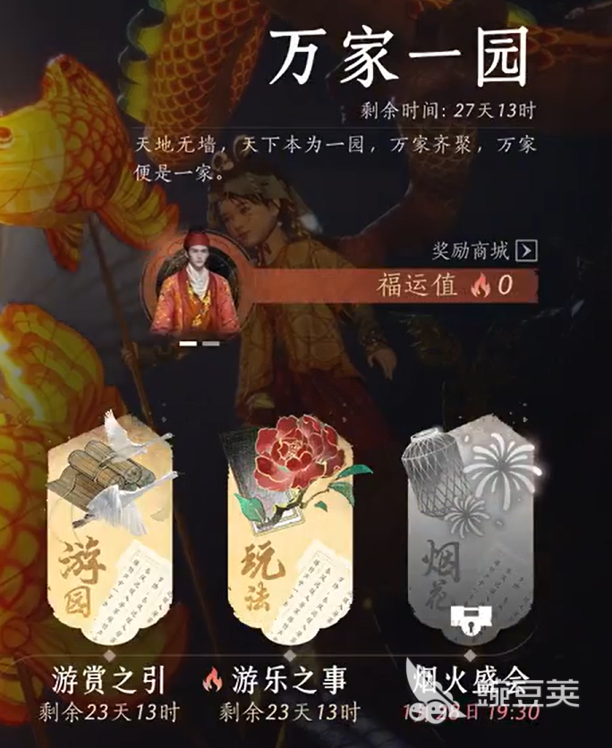 那么,有什么其他获取绕梁之音的办法吗?当然是有的,比如说最近的新年活动里,玩家就可以白嫖到5个绕梁之音。首先,在万家一园的活动里,玩家能在右下方看到三个入口,其中名为”游乐之事“的入口里,有走马观花这个活动可以参与,通过这个活动,玩家能够获得800点福运值。只要720点,你就能兑换5个绕梁之音了。