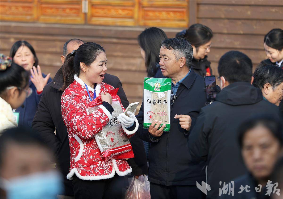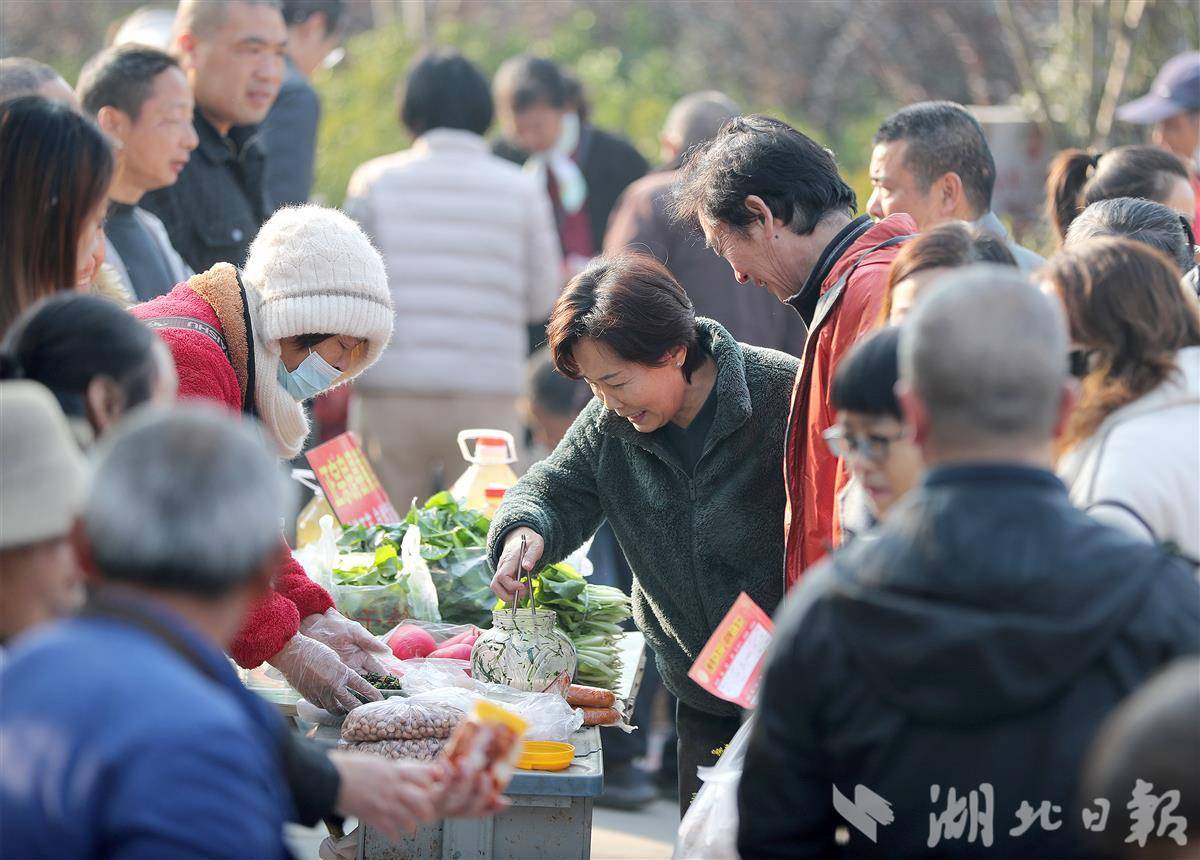 12月6日,荆门市东宝区子陵铺镇八角村“乡村大席”火热开席,吸引众多游客前来选购当地农特产品。
